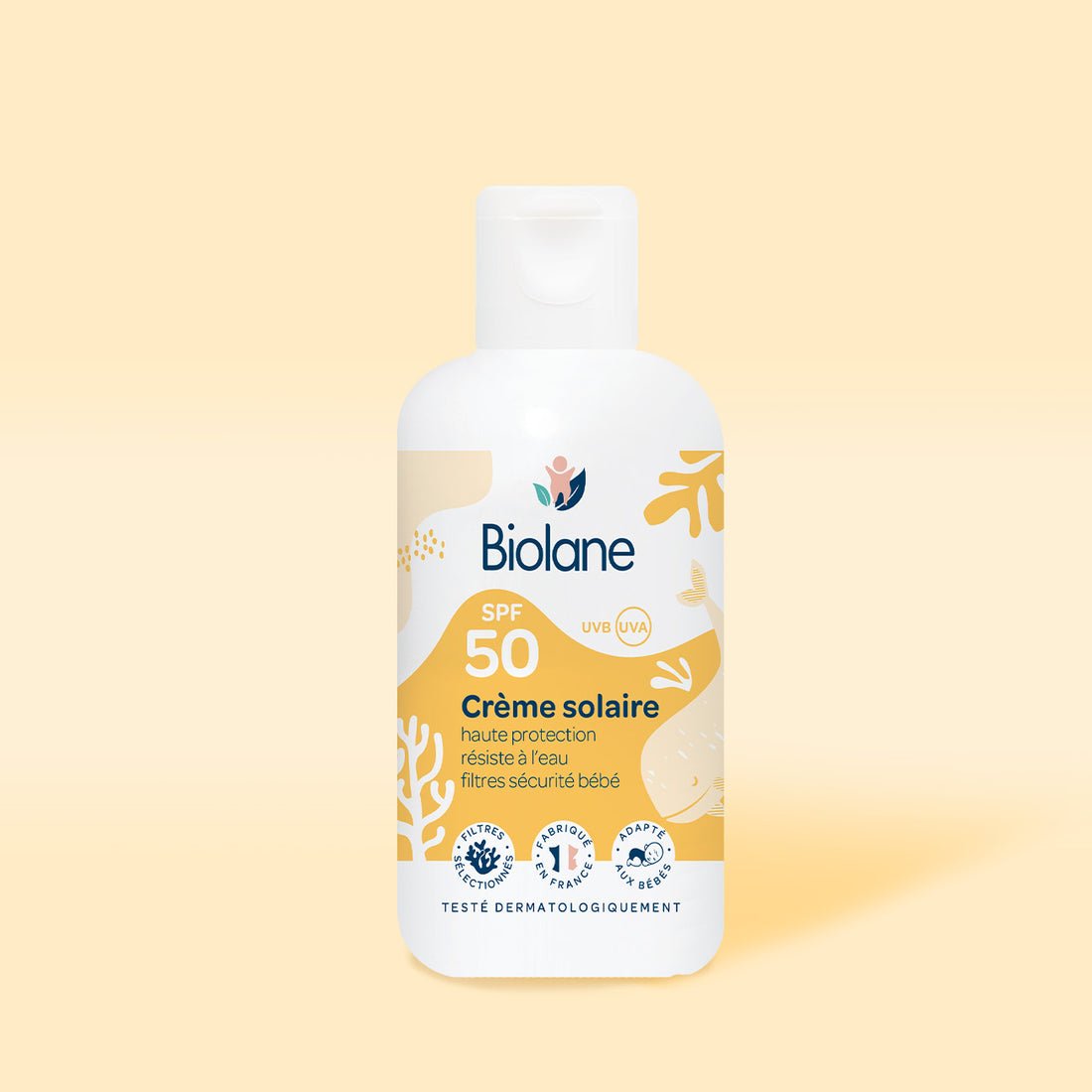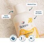 La crème solaire SPF50 Biolane garantit une haute protection solaire pour la peau de votre bébé. Une combinaison de 4 filtres solaires : sécuritaires pour le bébé et respectueux des océans.